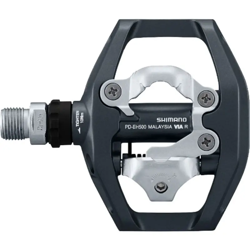 Shimano PD-EH500 SPD PedalsShimano PD-EH500 SPD Pedal is your versatile dual-sided pedal that’s has you ready for your next cycling adventure. The EH500 has a traditional platform on one side and an SPD step-in design on the other. The SPD mechanism is designed to make frequent stepping in and out easier than the usual pedal while the flat side offers better grip for stable pedaling , even in wet conditions. The pedal offers adjustable cleat tension settings on the SPD side and 8 replaceable pins on the platform side.689228866317