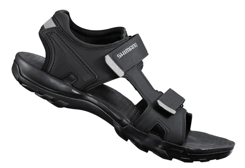 Shimano SH-SD501 MTB Touring Sandal Size 40 Black The Shimano SH-SD501 MTB Touring Sandal feels just right for open toed riding. Classic dual strap design. The flat foot bed is great for all day comfort. Glass Fiber Reinforced Shank Plate for efficient power transfer to your pedals. Smooth mesh and synthetic leather liner for barefoot riding comfort. There is a stable rubber sole that is great for walking and riding. The synthetic leather upper has moisture control mesh layering. Available in Black. 192790753935