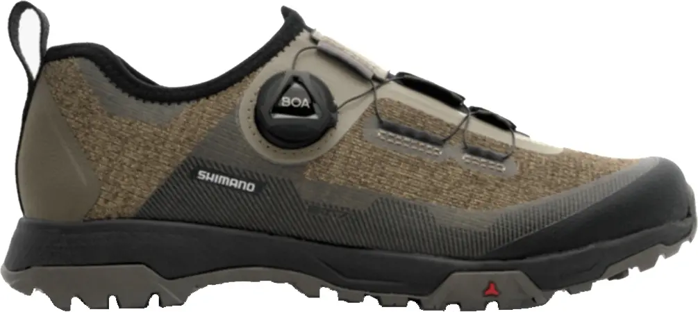 Shimano Women’s SH-ET701 Shoe 38 Almond Brown The Shimano Women’s SH-ET701 Shoes are flat-sole touring shoes optimized for multi-weather e-bike commutes and trekking trips. The tri-panel closure with BOA Fit System featuring an L6E dial delivers a micro-adjustable, precision fit for secure pedaling and walking. The SPLASHSHIELD forefoot membrane protects toes with light water resistance without affecting fit or comfort. These shoes are more sustainably made with 18% recycled mesh upper and midsole, by weight. The semi-rigid Power Transfer Blade midsole gives a more efficient pedaling power transmission. The adaptive outsole cross-grooves create a better grip with various types of pedal cages and pins. The 360° Traction sole block pattern offers better grip on various types of pedals and terrain. The hike and descent traction design block pattern on heel and toe provide great grip on variable terrain. Available in Almond Brown. 192790959771