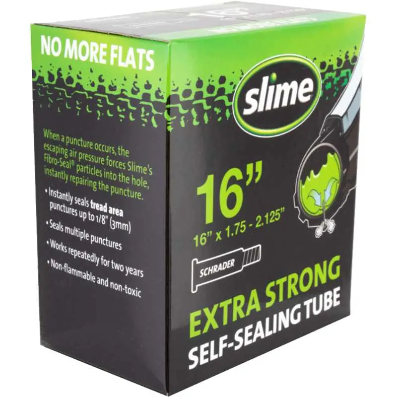 Slime Self Sealing Tube 16x175’’ SchraderSlime Self Sealing Smart Bike Tube 16x1.75-2.125. Self-Sealing Smart Bike Tubes with SLIME Inside. All SLIME Smart Tubes are factory-filled with a precise volume of SLIME Tube Sealant. Smart Tubes instantly seek out and seal punctures as they occur, preventing flats, repeatedly and continuously for up to two years. Ride without worries.716281006272