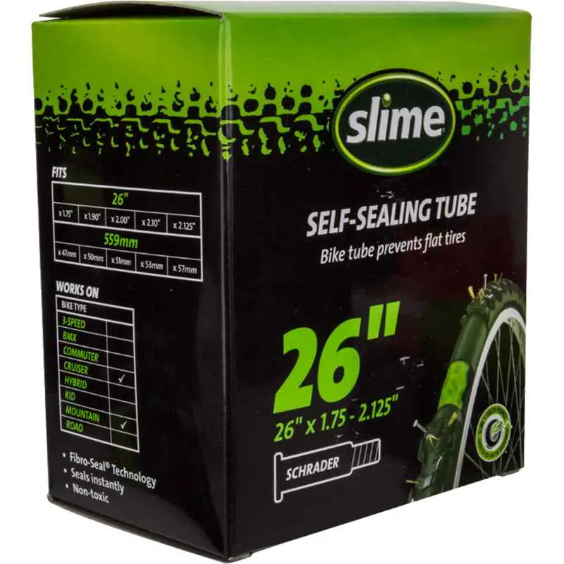 Slime Self Sealing Tube 26x175" SchraderSlime Self Sealing Smart Bike Tube 26x1.75-2.125". Self-Sealing Smart Bike Tubes with SLiME Inside. All SLiME Smart Tubes are factory-filled with a precise volume of SLiME Tube Sealant. Smart Tubes instantly seek out and seal punctures as they occur, preventing flats, repeatedly and continuously for up to two years. Ride without worries.716281006210