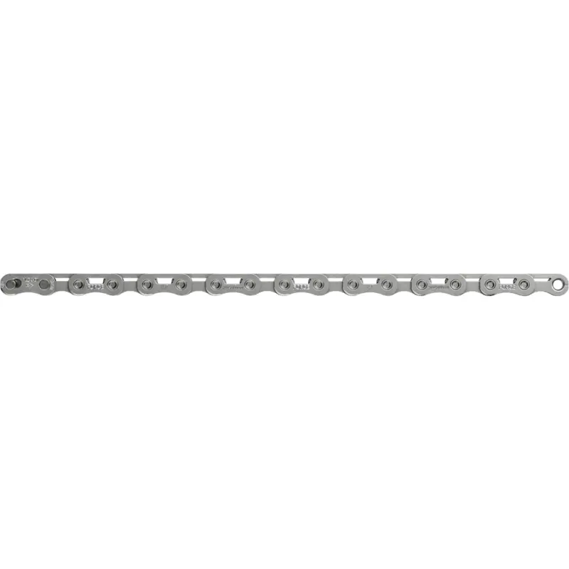 Sram Force E1 Flattop Chain 12/13 Speed Chain 126 Links Silver The Sram Force E1 Flattop Chain 12/13 Speed Chain is lighter, stronger and even more durable. The Flattop technology creates a quieter, longer lasting chain for long rides and countless shifts. The Force chain is compatible with 12-speed road and 13-speed gravel cassettes. This Hard Chrome chain has four times the wear resistance to other Sram chains because of a new finishing process to the inner links and rollers. The Flattop PowerLock is a tool free way to connect the chain, although it is only able to be fastened one time each. The Flattop technology gives this thinner chain shape the ability to be used on a wider gear range while improving both strength and durability. Weighs 244g. Available in 126 links in Silver. 710845915284