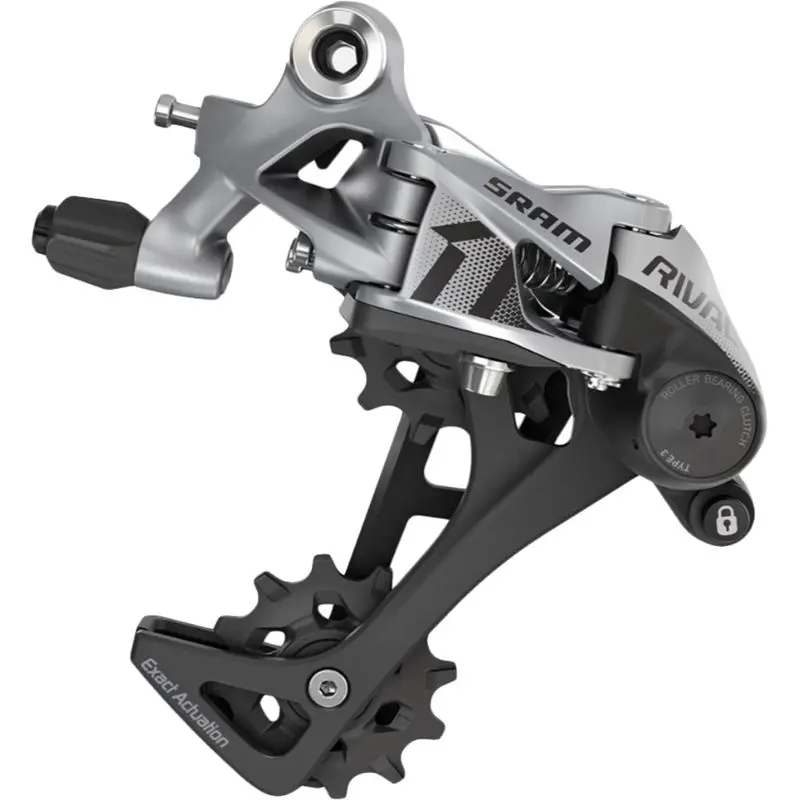 Sram Rival 1 Type 3.0 Rear Derailleur 11 Speed Long Cage BlackThe Sram Rival 1 Type 3.0 Rear Derailleur is engineered for 1x11 Sram setups for smooth shifting and less ghost shifting and chain dropping. The Exact Actuation gives fast and accurate shifts using SRAM's 1:1 actuation ratio. The X-Sync pulley features a 12-tooth design that helps control the chain's lateral movement. The Roller Bearing Clutch controls chain tension for consistent shifting. X-Horizon straight parallelogram design limits all movement to the horizontal axis, which makes ghost shifting impossible while also reducing shift force. Cage Lock technology makes for fast wheel changes or chain installation. The long cage has a 42t maximum, steel pully bearings, and an aluminum cage.710845807879