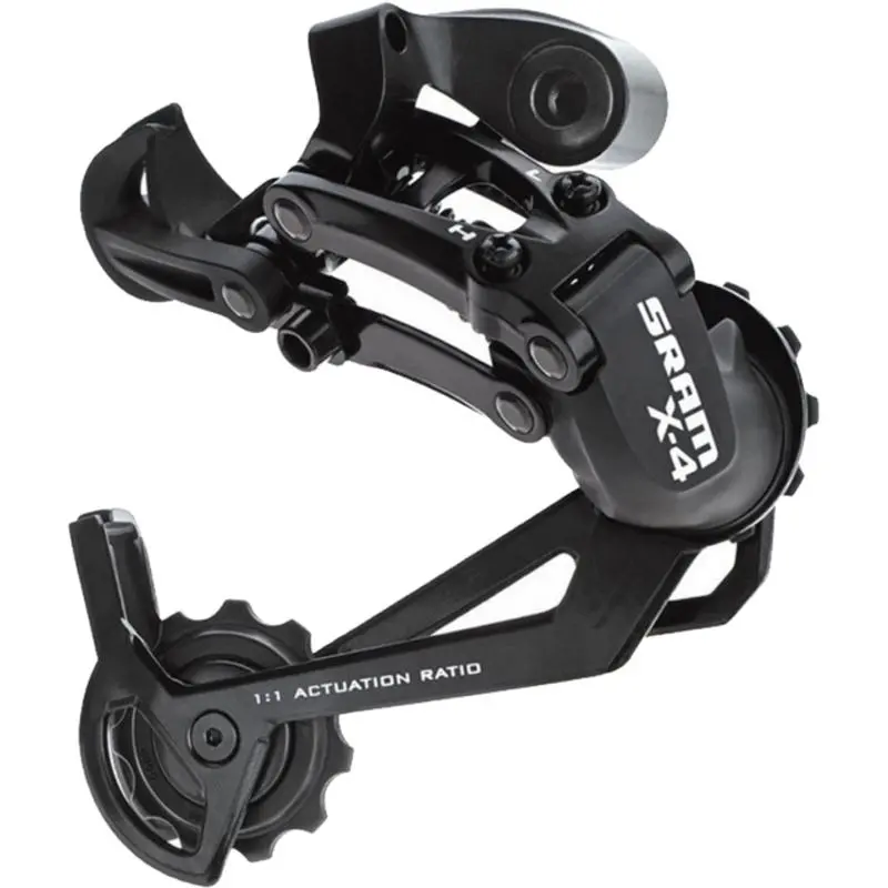 Sram X4 Rear Derailleur Long Cage BlackThe Sram X4 Rear Derailleur uses a Steel/Composite Cage with replaceable pulleys to demonstrate Sram’s 1:1 Actuation Ratio and Direct Route Technology to redefine the feeling of smooth shifting. The B-Knuckle is composed of the rugged 6061 Alloy. Weighs only 340 grams. Black in color.710845609671