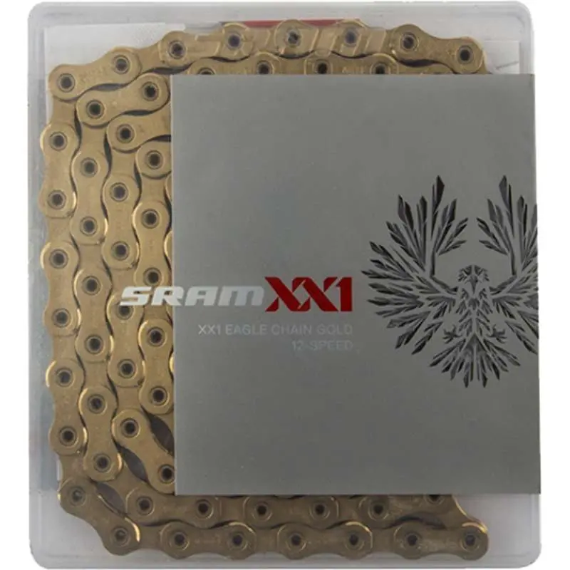 Sram XX1 Eagle 12s Powerlock Hollow Pin Chain GoldThe Sram XX1 Eagle 12s Powerlock Hollow Pin Chain uses groundbreaking technology to deliver a quiet, smooth, and rugged chain to your bike. Compatible strictly with Eagle 10-50t cassettes to give you re-engineered FLOWLINK Technology to increase longevity and chain-guiding. The XX1 Eagle chain is the quietest, strongest, and most wear-resistant chain yet. Includes Eagle PowerLock PVD Closing Link. Available in Gold.710845788482