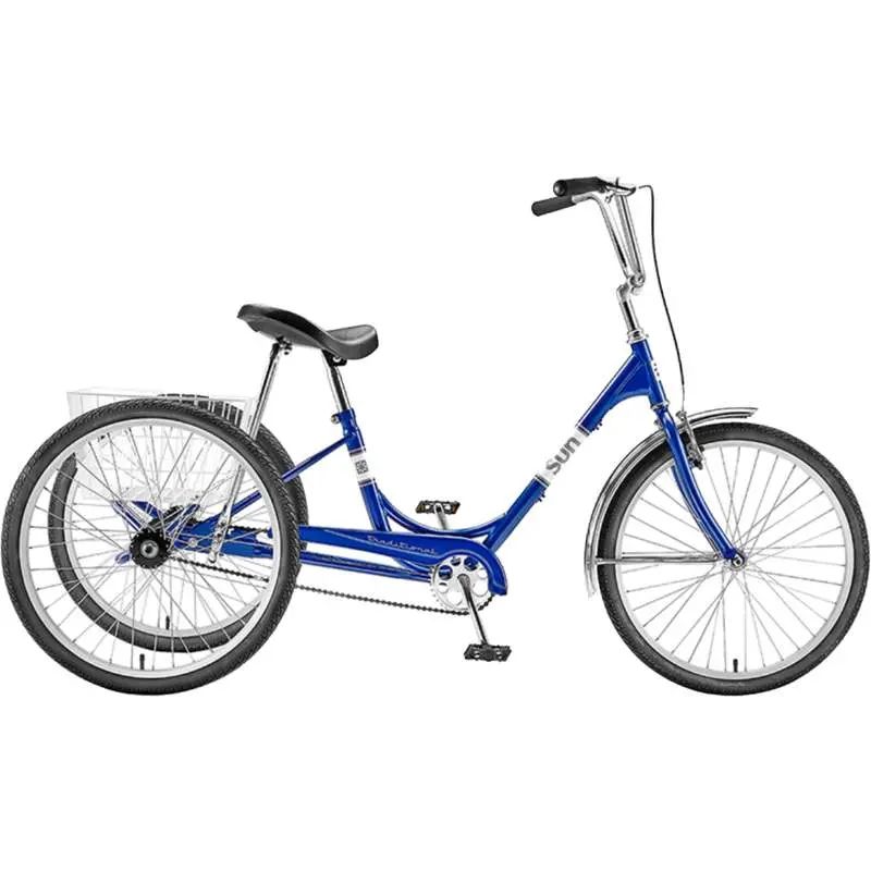 Sun Miami Traditional 24’’ Trike BlueThe Sun Traditional 24’’ Trike is a perfect single speed treat when you want to get around in comfort and style. The High-tensile steel Low-Step frame is perfect for anyone to get on and off easily. This is equipped with an alloy linear-pull front brake with parking lock and uses a one-piece crank with a caged bearing bottom bracket. This Trike comes with 24x1.75’’ tires and a 9’’ high-rise steel handlebar and stem. The Sun Tractor Saddle has a heavy duty steel base, the rider weight limit is 250lbs. Comes with a vinyl coated steel wire basket, steel chain guard, and nickel plated front fender.888571014523