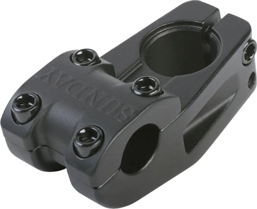 Sunday Freeze Top Load Stem BlackThe Sunday Freeze Top Load Stem is die-cast aluminum with a forged 6061-T6 aluminum face plate. The bottom and sides are recessed to eliminate weight. These stems have 52mm of reach, a 33mm stack height, and a 34mm rise or 1mm drop while inverted. The 4 Clamp Bolts measure 8x1.25mm, and the 2 Pinch Bolts measure 8x1.25mm. Weighs 10.5 ounces.630950914593