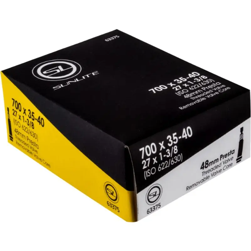 Sunlite 27 x 1 3/8 700 x 35-40mm Tube Threaded Presta 48mm Removable CoreThe Sunlite 27 x 1 3/8 700 x 35-40mm Tube is made of durable Butyl rubber and has a wall thickness of 0.9mm. These tubes come with a 48mm threaded Presta valve. The valve core is removable.072774633753