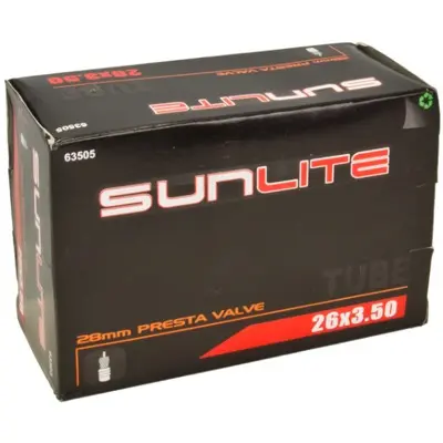 Sunlite Fatbike 26 x 3.5 Presta Tube The Sunlite 26 x 3.5 Presta Tube is the perfect replacement tube for any fatbike but especially the Sun Crusher series. The slightly offset threaded presta valve will integrate directly into your extremely wide rims: with the thick rubber used you should have no issues with pinch flats. A removable valve core means that you can fill ‘er up with any sealant on the market to prevent future flats. 072774635054