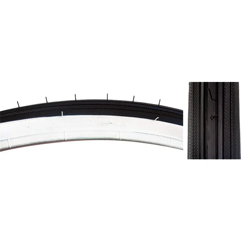 The Sunlite 27x1 1/4 Tire Black/White Wall has a standard smooth road tread with center ridge and herringbone side tread. Max PSI: 70. Weighs only 493g.