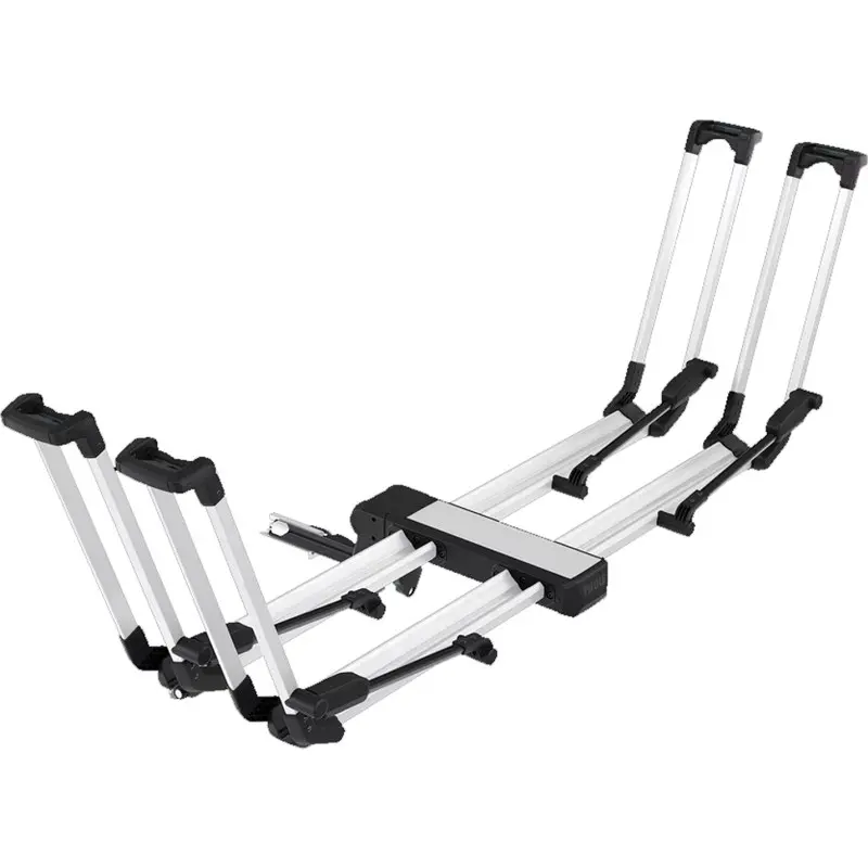 Thule Helium Platform XT 904011The Thule Helium Platform XT 904011 is a premium aluminum platform bike rack is fully lockable, easy to use, and holds two bikes without frame contact. This rack lets you quickly attach bikes and easily secure them to the rack using the ratcheting wheel loops. The aluminum construction makes it easy to use, install and remove. Effortlessly fold down bike arms when rack is not in use. Convenient access to the rear of the vehicle using the HitchSwitch lever to tilt the rack down, even with bikes on it. Bikes have 10’’ apart from each other, ideal for carbon frames. Fits 26”-29” wheel sizes up to a 3” wide tire. Lock bikes to the rack using the included integrated cable lock. Easy to lock the rack to the vehicle due to the tool-free, SnugTite stinger lock. 2 Bike Max Capacity. Load Capacity 90lbs. Max Weight Per bike 45lbs. Weighs 43.2lbs after assembly.091021899544