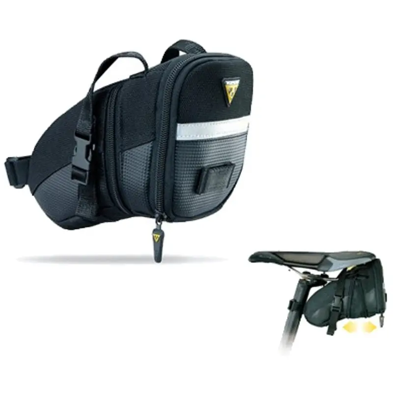 Topeak Aero Wedge Bag Medium w/Straps TC2261BTopeak Aero Wedge Bag w/Straps has an Aerodynamic style with traditional strap mount too easily connect to a seat. 1200 Denier Polyester is a higher quality material than most other bags use. Bag expands to accommodate larger items. Reflective piping for night time safety.768661114497