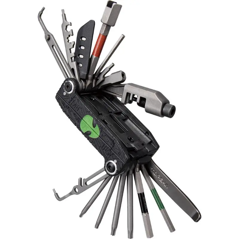 Topeak ALiEN X Multitool TT2585The Topeak ALiEN X Multitool features T10 / T15 / T20 / T25 / T30 Torx® tools and adds a master link pliers for use on master link equipped single/multi-speed chains. Two-piece design allows easy access and full use of all tools and adds leverage when tightening bolts. Includes self-tightening tools and a nylon bag. Comes with 1.5-L / 2-L / 2.5 / 3 / 4 / 5 / 6 / 8 mm hex wrenches, 10 hex socket, T10 / T15 / T20 / T25 Torx® wrenches, T30 Torx® socket, 14G / 15G / Mavic M7 / Shimano® 4.5mm spoke wrenches, 6CrMo steel chain tool*, chain hook, CrMo steel master link pliers, Super hard anodized tire lever, #2 Phillips sockets, Serrated knife/saw, and Presta valve core tool.883466019355