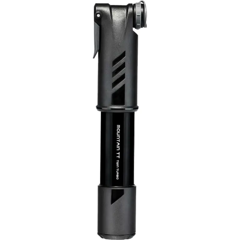 Topeak Mountain TT Twin Turbo Frame Pump TMTT-1The Topeak Mountain TT Twin Turbo Frame Pump uses dual action pumping head to increase the efficiency of pumping while you are out on the trail. The large aluminum barrel allows a large amount of air to refill your regular or fat tires while you are on the trails. There is an integrated dust cap to prevent excesses wear. The thumb lock lever seals in air while you pump. The head adapts to Presta, Schrader, and Dunlop valves. With each stroke, up and down, 91cc of air is moved. This pump has a capacity of 120 PSI or 8 bar. There is a side mount bracket to bring this pump along. Weighs only 192g or 6.77oz. The dimensions are 22 x 5 x 4 cm / 8.7” x 2” x 1.6”.883466016286