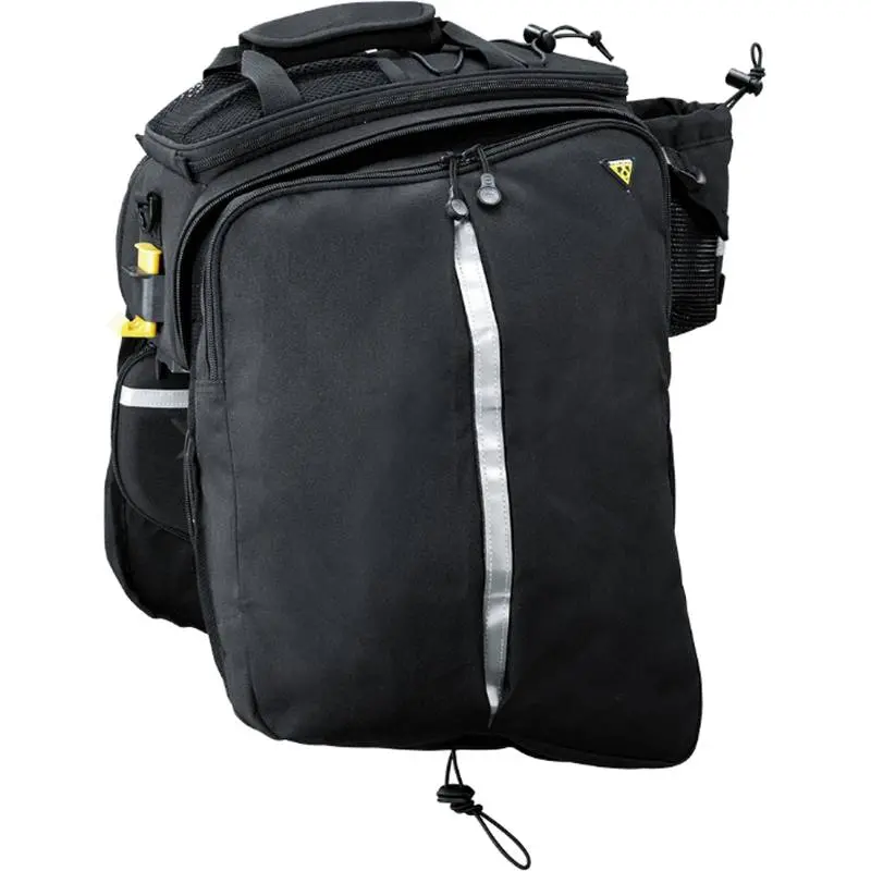 Topeak MTX Trunk Bag EXP with Bottle Holder TT9647BThe Topeak MTX Trunk Bag EXP with Bottle Holder is a large storage solution and extra water bottle carrier for your grand adventures. With a 16.6 Liter or 1010 cubic inch capacity you will have plenty of space. The 600 Denler Polyester Outside resists water. There is a shoulder strap, carrying handle, multiple top elastic bungees, 3M Reflective Strip, Safety Light Clip, and Rigid EVA Foam for visibility and longevity. Compatible with the MTX QuickTrack System. The compartment layout has one Divided Main, two Side Zippered, and two expandable pannier bags. Dimensions: 36x21.5x21cm or 14.2’’x9.8’’x8.5’’.883466011052