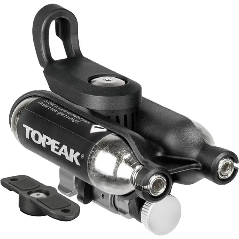 Topeak Ninja Master+ CO2 FuelPack TNJA-MABThe Topeak Ninja Master+ CO2 FuelPack mounts under Ninja water bottle cage with interchangeable Cage Mount or use alone with Frame Mount. The CO2 FuelPack is made from CNC aluminum, fixes flats, and inflates in a flash. Compatible with Presta and Schrader Valves. Comes with 2 threaded 16g CO2 cartridges with a compartment for CO2 inflator and cartridge. Weighs only 129g.883466034181