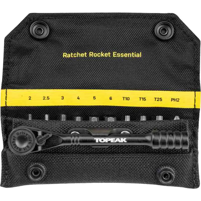 The Topeak Ratchet Rocket Essential is an ultra-compact CNC machined aluminum ratchet tool kits with 10 bits for daily maintenance. Features include magnetic bit holder, carry bag, 30mm bit length, Color coding, aluminum ratchet tool, nylon bag, S2 hardened steel bits. Comes with 2 / 2.5 / 3 / 4 / 5 / 6 mm hex wrenches, T10 / T15 / T25 / PH2 heads.