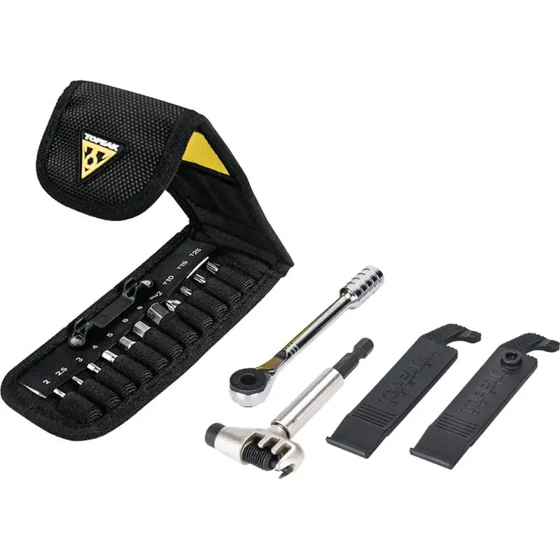 Topeak Ratchet Rocket Lite DX+ Toolset TT2579The Topeak Ratchet Rocket Lite DX+ TT2579 features 20 functions with several tools for adjustments and repairs on the go in a compact arrangement. They include a fine tooth ratchet mechanism with reverse lever and thumb wheel for quick rotation and control in tight spots and includes hardened steel tools in 2, 2.5, 3, 4, 5, 6 and 8 mm hex, T10, T15, T25 Torx® and #2 Phillips bits, CrMo steel chain tool, two engineering grade polymer tire levers and magnetic bit holder. Weighs only 195g with the nylon bag.883466018235