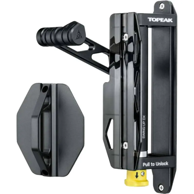 Topeak Swing-Up DX Bike Holder TW019The Topeak Swing-Up DX Bike Holder lets you carefully hang you bicycle with multiple angle options to fit the room best. The max weight capacity is 16kg/35lbs. This system is compatible with wheel tire combos with height up to 8cm (3.15’’) and tire width up to 6.6cm (2.35’’). Can be locked down in 15 degree increments for optimal special use. Made from aluminum, steel, and engineering grade polymer. The front wheel bar is rotatable to give you more options for placement. Dimensions: 29.3 x 16 x 7.7 cm / 11.5” x 6.3” x 3”. Weighs 950g or 2.1lbs.883466012448