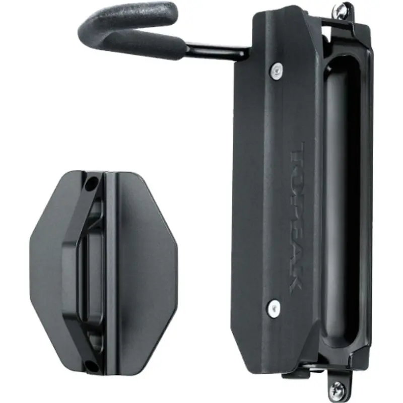 Topeak Swing-Up EX Bike Holder TW018The Topeak Swing-Up EX Bike Holder lets you carefully hang you bicycle with multiple angle options to fit the room best. The max weight capacity is 16kg/35lbs. This system is compatible with wheel tire combos with height up to 8cm (3.15’’) and tire width up to 6.6cm (2.35’’). Made from aluminum, steel, and engineering grade polymer. The front wheel bar is rotatable to give you more options for placement. Weighs 950g or 2.1lbs.883466012455