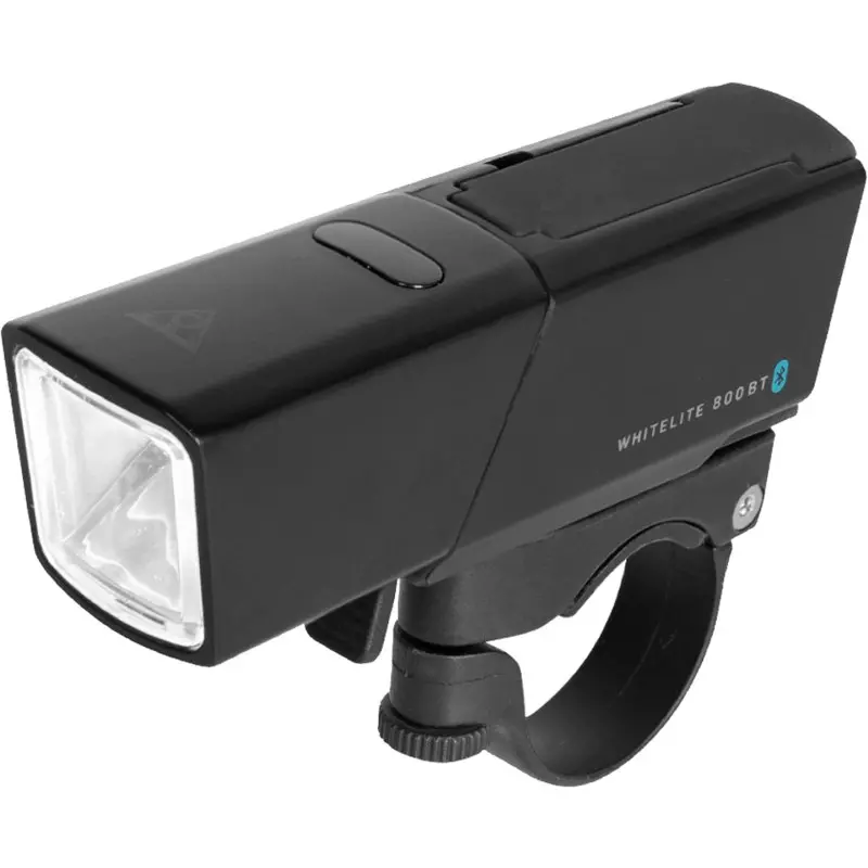 Topeak WhiteLite 800BT Headlight TMS100BTThe Topeak WhiteLite 800BT TMS100BT is a high powered 800 lumen front light with five settings. USB C rechargeable with Bluetooth® 5.0 enabled wireless control and features a built-in remote-control button for compatible rear light. The Dual Zone refractor lens allows clear near and far visibility by focusing the main beam downward to prevent blinding pedestrians or oncoming traffic. Optical enhancements increase side visibility for safety on your night rides. Included handlebar mount and adapters provide mounting flexibility. Approx Run Time: High - 800 lumens 3.5 hours, Middle - 400 lumens 5 hours, Low - 200 lumens 9 hours, Blink - 200 lumens 20 hours, Pulse - 400 lumens 40 hours. When the low battery indicator turns on, there is still 30 minutes left of battery light.883466033955